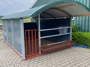 - Voorzien van een voerhek met verstelbare halsbuis en een loopdeur aan voorzijde