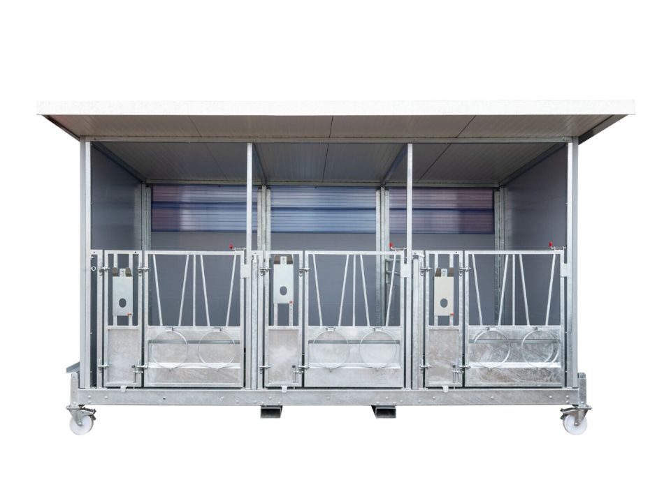 De KMAX3 is een innovatieve kalverhuisvesting dat bestaat uit drie aaneengeschakelde eenlingboxen, die eenvoudig om te vormen zijn tot één ruim groepshok voor drie kalveren.
